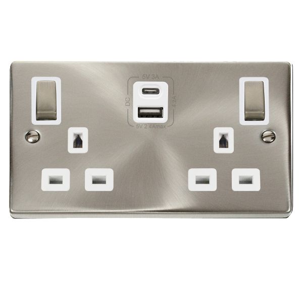 Description: Socket, 2 Gang Switched c/w Twin USB Outlet, Type A & Type C