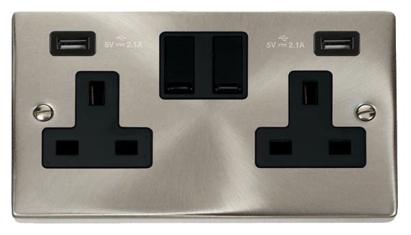 Description: Socket, 2G Switched c/w Twin USB Outlet, Black Insert Victorian