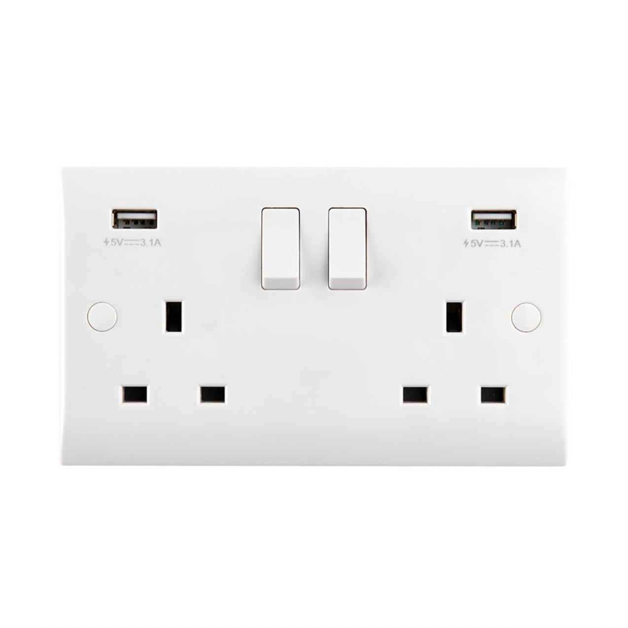 PlusSwitch 2 Gang Single Pole Switched Socket 13A - White with USB Ports