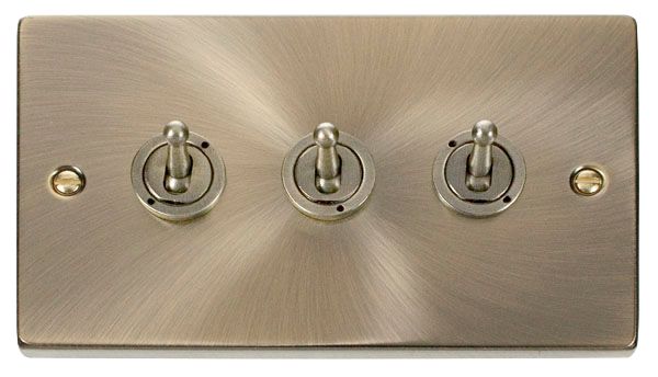 Description: Toggle Switch, 3 Gang 2 Way, Black & White Gasket Victorian