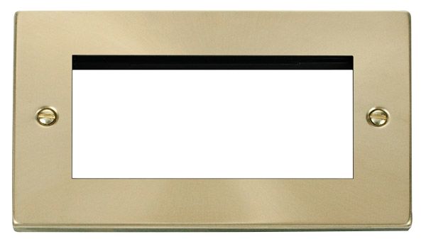 ['Integrated yoke (no yoke required)', 'Utilises New Media' modules', 'Victorian square edge plate design', 'Satin brass plate with black & white gasket']
